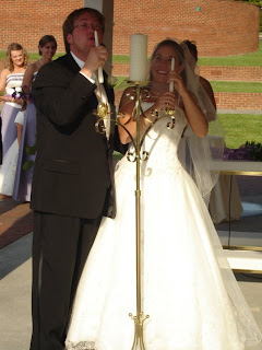 It couldn't have been a more wonderful day! The sun was shining, there was a breeze blowing, it was just perfect. We had an ice cream truck that rode by the square during the ceremony playing its a small world, that was pretty funny. The unity candle wouldn't light either because of the breeze, but I needed that breeze because it was HOT under all that crinoline!